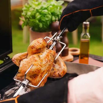 De Boretti Rotisserie is een geweldige aanvulling van jouw Boretti barbecue. Met de rotisserie kun je een heerlijke malse kip, lamsbout of rollade bereiden. Doordat de rotisserie rotaties maakt wordt je vlees gelijkmatig door een sterke elektromotor bereidt, waardoor je zelf niks hoeft te doen. Geschikt voor Imperatore 4B en Imperatore BI.